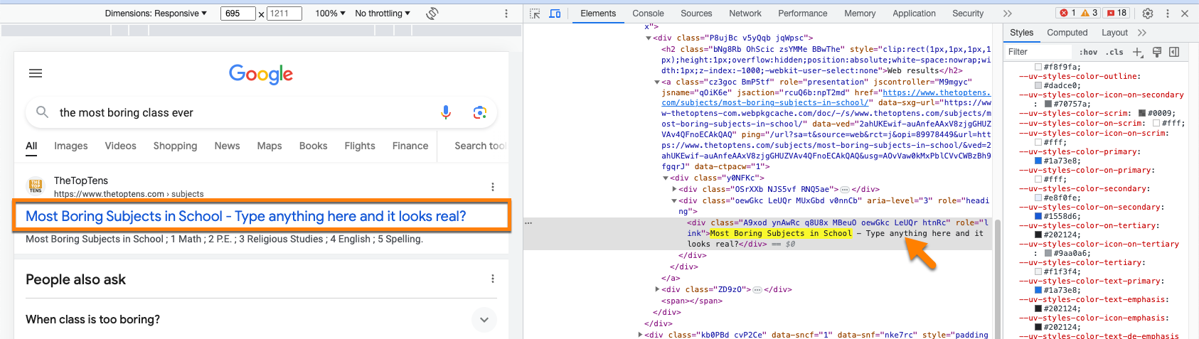 The original text in a website, news article or search results is replaced with intimidating text using Developer Tools in Chrome and Edge. The person editing the code hides the Developer Tools panel before showing the web page to other students to get a reaction. The updated code will temporarily display the text until the web page is refreshed.