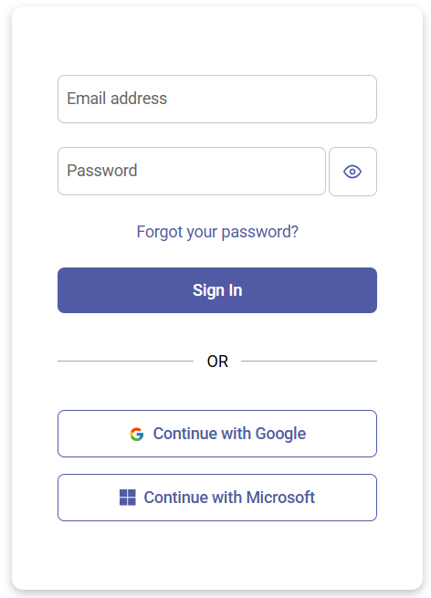 Sign in with Single Sign-On (SSO): Select Continue with Google or Continue with Microsoft to sign in with your Google or Microsoft account. If your organization requires MFA, complete the Multi-Factor Authentication process.